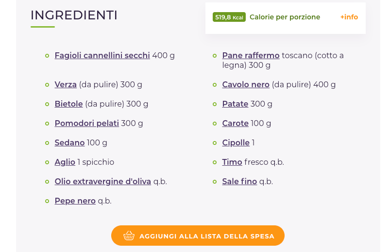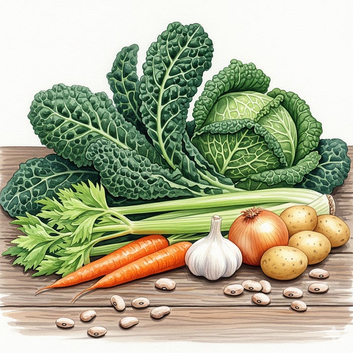 Gli ingredienti principali sono verdure (come cavolo nero, cavolo verza e fagioli) e pane raffermo (pane vecchio, del giorno prima).